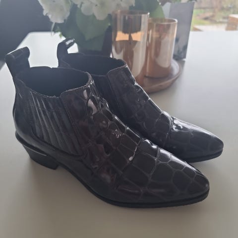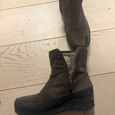 Stockholm Design Group støvler i størrelse 38. Støvlene har beige overdel i skinn med snøring og metallhemper, samt polstret ankelparti for ekstra komfort. Grov yttersåle i gummi gir godt grep. Foret med ull.
