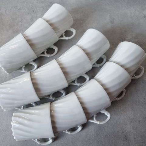 Kaffeservise Bogstad Hvit fra Porsgrund Norway. 11 kopper, 12 tefat og 12 tallerkner, fløtemugge og sukkerkopp. Serviset må hentes i Trondheim, evt på Røros under Martnan’n