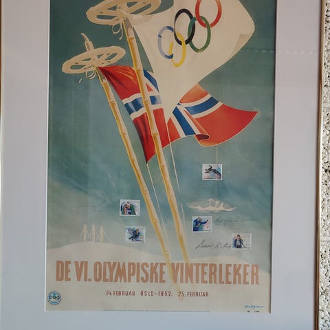Plakat med motiv fra De VI Olympiske leker 1952. Signert av heltene: Arnfinn Bergmann, Stein Eriksen, Simon Slåttvik, Hallgeir Brenden & Hjalmar 'Hjallis' Andersen.