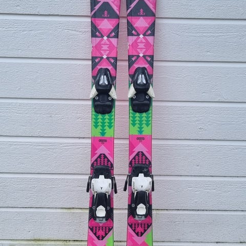 K2 Luv Bug alpinski på 100 cm med integrerte bindinger. Skiene har et fargerikt design i rosa og oransje med grafiske mønstre. Breddeangivelse på skiene er 74–70–84 mm. Modellen er laget for barn og passer til alpint bruk i preparerte løyper. Bindingene er montert på skiene og er justerbare innenfor et visst spenn av skostørrelser, avhengig av sålelengde på støvlene.