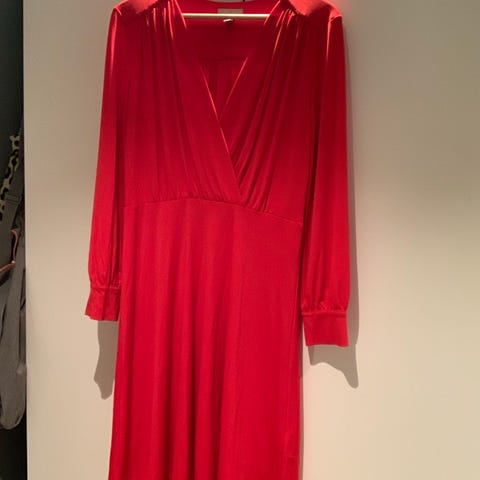 festkjole for dame i størrelse M. Kjolen er rød og i polyester. Den har lange ermer og tettsittende fasong med rynkedetaljer i siden. Stoffet har små glitrende detaljer som gir et dekorativt uttrykk. Egner seg til fest og andre anledninger der man ønsker en enkel, rød kjole med litt glittereffekt