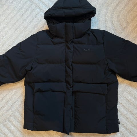 Fint brukt jakke selges. Litt sminkeflekker ved halsen (skal prøve å fjerne så mye som mulig), litt fiber fra ull og klær på borrelåser - men de fungerer som de skal enda. Den er svart, men ser mørkebrun ut pga lyset når bildene ble tatt. Siste bilde viser fargen.