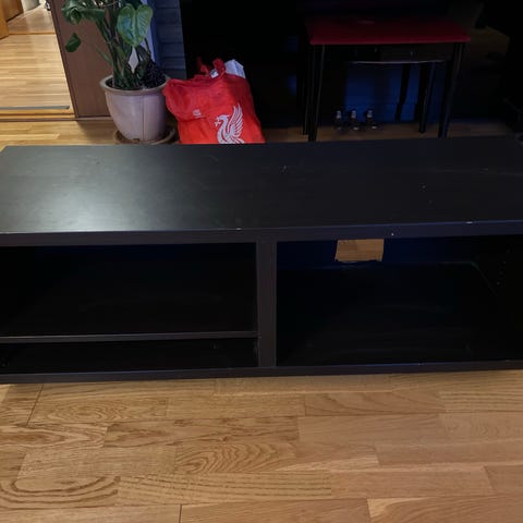 TV-benk i mørk trefarge med blank overflate. Benken har minst én glassdør i midten og lukkede skapdører på sidene, som gir oppbevaringsplass til TV-utstyr og annet tilbehør. Jeg er ikke sikkert er dette IKEA. 3 deler. Opp er med glass.