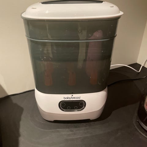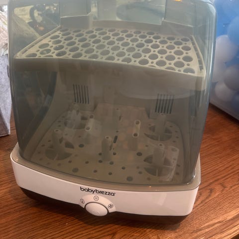 Baby Brezza flaske- og tilbehørssterilisator for elektrisk damping av tåteflasker og smådeler. Enheten har plass til flere flasker samtidig, med holdere for flasker og tilbehør i innsatsen. Ytre del består av en hvit base med kontrollpanel og gjennomsiktig overdel. Produktet kobles til strøm med medfølgende ledning og brukes til sterilisering av tåteflasker, smokker og annet babyutstyr som tåler varmebehandling.