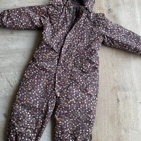 Dressen har et nydelig, rosa blomstermønster. Modellen har hette, elastikk i midjen og strikk ved håndledd og ankler for bedre passform. Det er fotstrikker nederst på beina og glidelås foran med knapp øverst.