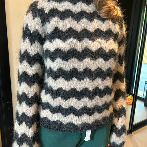 Dear Dharma genser for dame i størrelse XL. Genseren er flerfarget med stripet mønster i ulike nyanser. Strikket i mohairull som gir et mykt og loddent uttrykk. Modellen har rund hals, lange ermer og ribbestrikkede kanter nederst og på ermene. Passer til hverdagsbruk og kan kombineres med både bukser og skjørt.