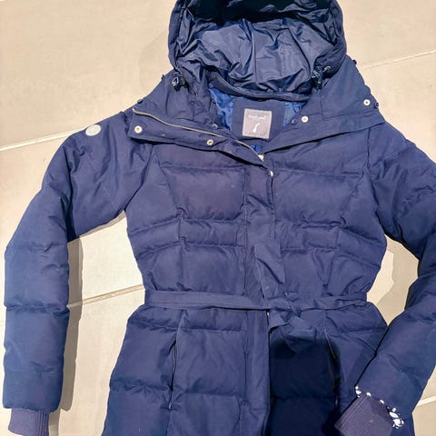 Jakken er blå og har ytterstoff i polyester. Fôret består av en blanding av dun og fjær, med polyesterfôr på innsiden.