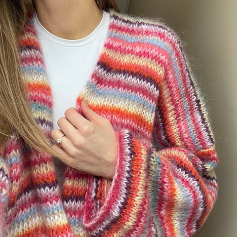 Cardigan strikket i Drops Melody i nydelig fargekombinasjon. Modellen er 176 cm/slank.