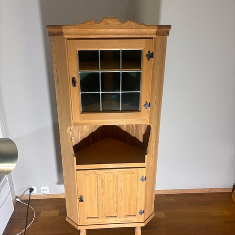 2 sidebord med skap i tre. Møbelet har en sekskantet form med topp-plate, åpen hylle i midten og skap med dør nederst. Utført i tre med synlig trestruktur og profilert dørfront med rund håndtaksknott. Egnet som lite sidebord eller nattbord med både åpen og lukket oppbevaringsplass.
