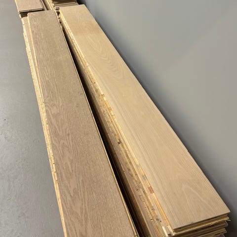 15 hele planker a 2050 x 205mm, resten er kappet for skjøting.