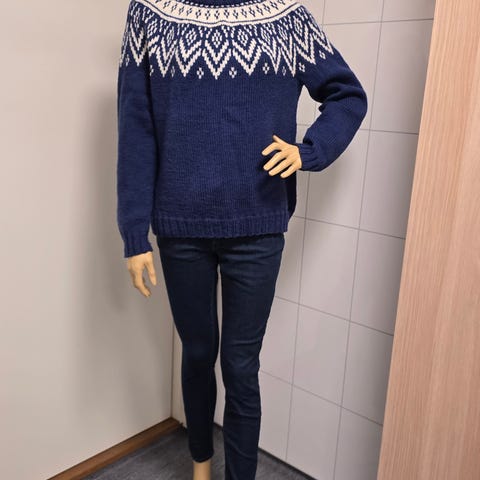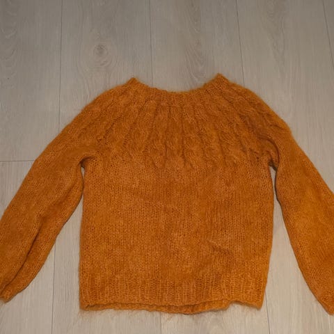 Hjemmestrikket kremhvit Jackie- genser fra Line Langmo. Strikket i Påfuglgarn fra House of yarn. 73% mohair, 22% ull og 5% polyamid.