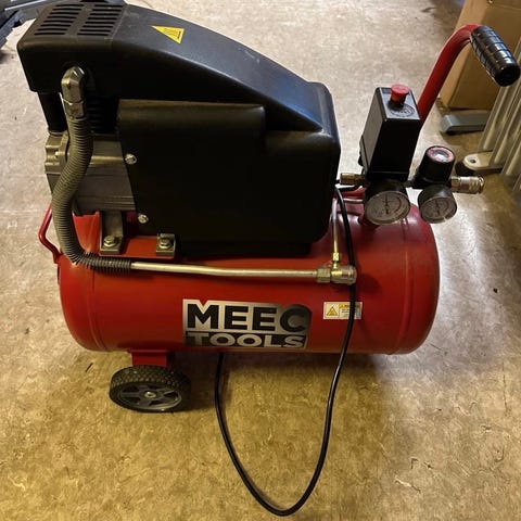 Kompressoren har håndtak og hjul for enkel forflytning, manometer for trykkavlesning og regulator for justering av arbeidstrykk. Egner seg til trykkluftverktøy, pumping og andre oppgaver som krever komprimert luft innenfor spesifisert kapasitet og trykk.
