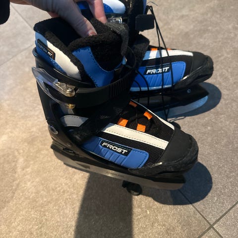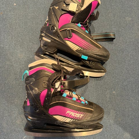 Frost justerbare skøyter for barn i størrelse 32-35. Modellen har hard yttersko i grå plast med rosa tekstilpaneler og polstret, myk innersko. Skøytene har justeringsmekanisme på siden for tilpasning av lengden, samt spenner og remmer for å holde foten på plass. Egnet til bruk som fritidsskøyter for barn på isbaner og lignende.