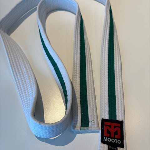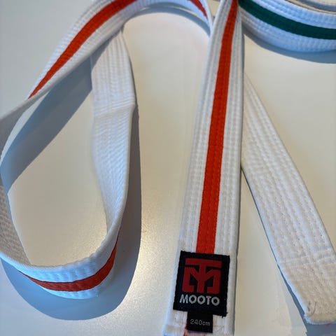 Mooto kampsportbelte i oransje farge. Lengde 240 cm, egnet for bruk til ulike kampsporter som taekwondo eller karate der denne beltestandarden benyttes. Beltet er sydd i flere lag for økt stabilitet og form. Passer til barn, ungdom eller voksne avhengig av høyde og knytemåte.