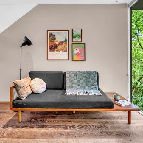 I god stand, ingen synlige merker i treverk eller tekstil. Treverket er mørk valnøtt, med lys grå puter. Har et “sidebord” med plass til lesestoff, kaffekoppen og pynt. Den skiller seg ut med sitt kule retrodesign, og er et møbel som vi har fått mange positive kommentarer på. Kan også brukes som sovesofa hvis ønskelig.