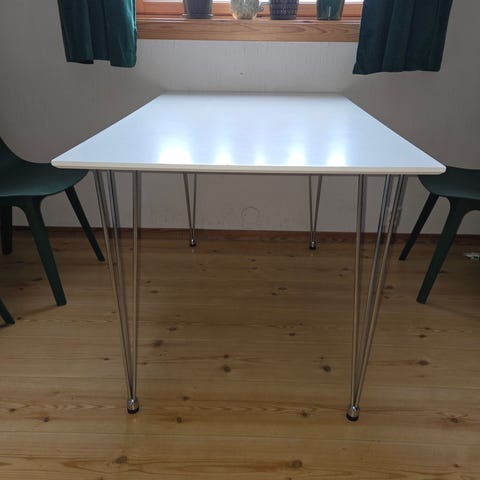Bordet og én ileggsplate er malt. Den andre ileggsplaten er i opprinnelig farge og har en del slitasje. Bordet er fullt funksjonelt, men bærer preg av bruk, men dette er tatt hensyn til i prisen.