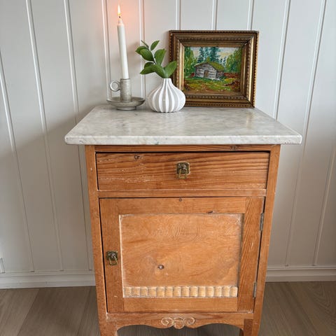 Skapet mangler en list på toppen og det medfølger ingen nøkkel. Skuffene trenger ny ring til å åpne disse med.