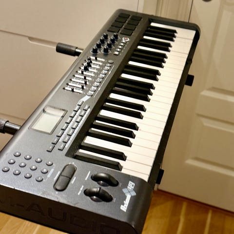 Arturia Microlab MIDI-keyboard med 25 anslagsfølsomme tangenter i kompakt format. Modellen kobles til datamaskin via USB og fungerer som MIDI-kontroller for musikkprogramvare og virtuelle instrumenter. Kabinettet har blå kant og innebygd kabeloppbevaring. Egner seg for enkel musikkproduksjon, komponering og innspilling i hjemmestudio eller på farten.