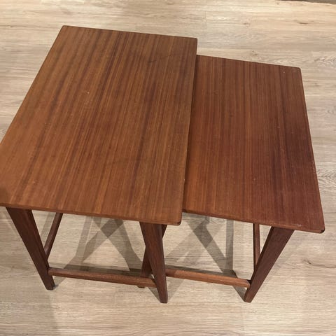 3 mørke settbord med buede ben som kan settes inni hverandre og ikke tar stor plass eller kan brukes hver for seg