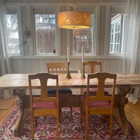 Nydelig gammelt spisebord og stoler i heltre eik.