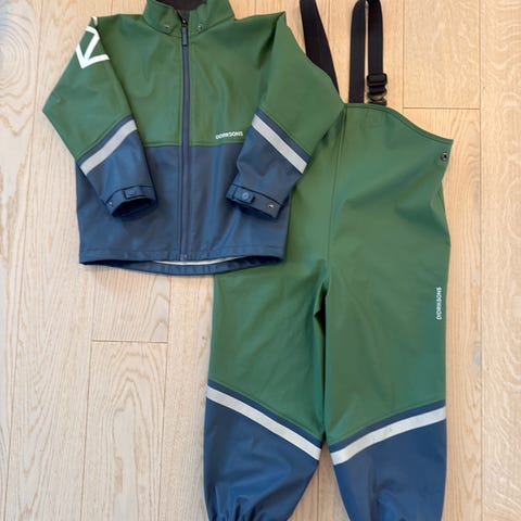 Didriksons regnsett for barn i størrelse 122. Sett med jakke og selebukse i svart rød farge. Materiale i polyester med Galon-overflate som er 100 % vanntett og vindtett. Jakken har hette, glidelås foran og refleksdetaljer på ermer og rygg. Buksen har seler, strikk nederst i bena og refleksdetaljer. Unisex-modell egnet til bruk i vått vær og utendørslek.