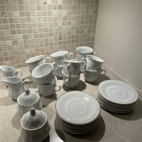 Kaffeservise bestående av seks kopper med tilhørende asjetter. Serviset er i hvitt porselen med dekor i gull og mønster langs kantene. Innsiden av koppene er gullfarget. Hver kopp har hank og leveres med matchende asjett. Egnet til servering av kaffe eller te ved borddekking til seks personer. Fra Tsjekkoslovakia