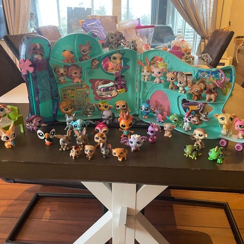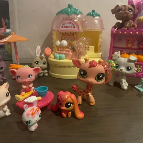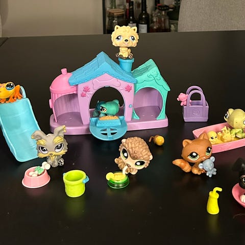 Littlest Pet Shop lekesett hus med flere dyrefigurer. Lekesettet består av et fargerikt hus med ulike rom, balkong og trehus-detaljer, samt mange små plastfigurer i ulike dyreformer. Passer til rollelek og samling av Littlest Pet Shop-figurer. Alle deler er i plast og er i små størrelser tilpasset barn som liker miniatyrfigurer og tilbehør.