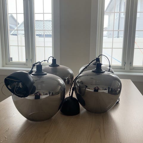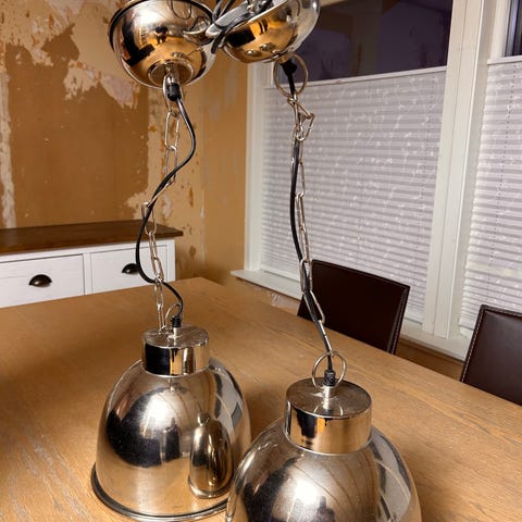 Taklamper i metall hamret overflate. Kobberfarge. Lampen har kuppelformet skjerm og oppheng med kjede og ledning. Ingen hakk eller misfarging. Passer som belysning over spisebord, på kjøkken eller i stue. Bruker E27 sokkel lyspære. Maksimum 40W. Det medfølger 1 pære i hver lampe. Pris er for 1. Ekstrem lavpris. Normal pris på Finn er 700,- for 1. Må hentes på Skansen 9, 4608 Kristiansand. Hentes etter avtale.