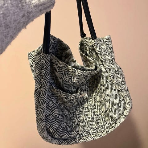Shopperen bæres i to små håndtak eller over skulderen med to lange, smale håndtak.
