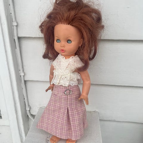 Dukke med langt, blondt hår og blå øyne. Dukken har bevegelige armer, ben og hode. Den har på seg en enkel truse. Hår og øyne er iorden, det samme er kroppen.