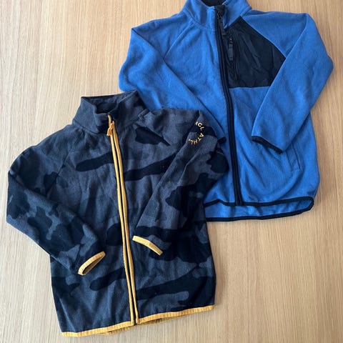 Klespakke med fleece-klær fra Vikafjell og Guppy. 2 stykk blå sett med bukse og jakke og en tykkere flerfarget fleece-jakke.