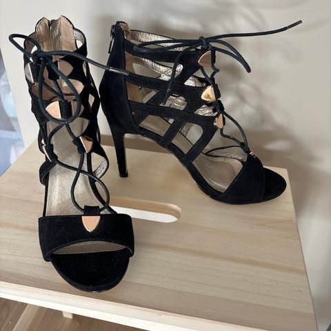 Hæler i svart semsket skinn med åpen tå og snøring oppover ankel/legg. Merket er XIT, og kjøpt på Din Sko for en god stund tilbake. Veldig normale i størrelsen. Hælhøyde 5-7 cm. Aldri brukt.