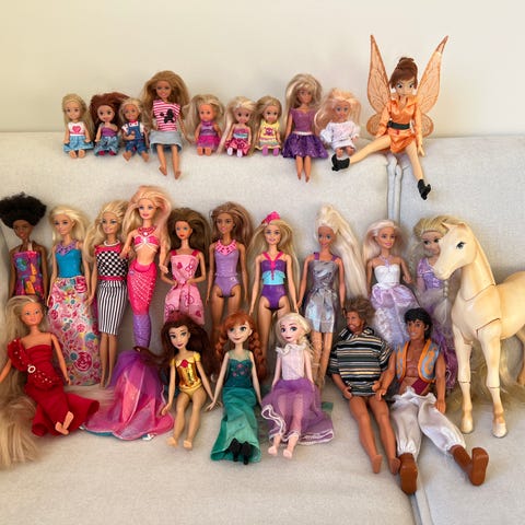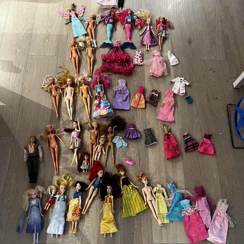 Dukkene er i varierende brukt tilstand. Noen har slitt hår, løse ledd eller kosmetiske spor etter lek. Klærne er blandet stand – noen fine, noen tydelig brukt.