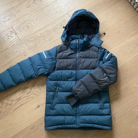Bergans dunjakke for gutt i størrelse 164. Jakken er i blå farge med to ulike blåtoner og har hette. Fyllet er dun, som gir god isolasjon. Jakken har glidelås i front og sidelommer med glidelås.