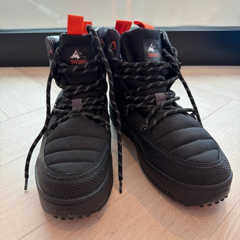 SWIMS vinterstøvler i størrelse 41. Støvlene er i hovedsak hvite med oransje og grå detaljer, og har snøring foran. Overdelen er i tekstil med polstret skaft og tunge for ekstra komfort. Kraftig yttersåle gir godt grep på vinterføre. Passer til hverdagsbruk i kaldt vær.