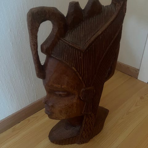 En skål utskåret av ett stykke mahogny tre stykke. Skålen har lokk og den er uthult innvendig for oppbevaring av småting. Det er utskåret løvehoder som dekorasjon.