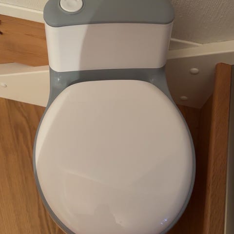 Barnetoalett potte i lyserosa plast. Utformet som et lite toalett med lokk, sete og avtakbar innerskål for enkel tømming og rengjøring. Toalettet har knapp på toppen som kan gi lyd- eller trykkfunksjon. Egnet for barn som skal øve på do- og pottetrening. Laget i hard plast som er lett å tørke av og flytte på.