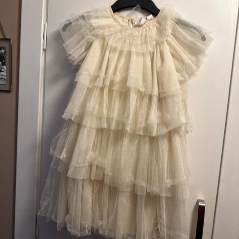 Penkjole str116. Kjolen er mørk blå med glitter på. Noe av glitteret har gått bort i vask men kjolen er ellers i god stand