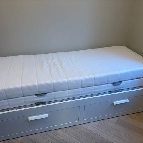 Sengen ble kjøpt ny på IKEA i mai 2023. Stått på gjesterom. Brukt lite, men har noen merker på seg etter flytting.