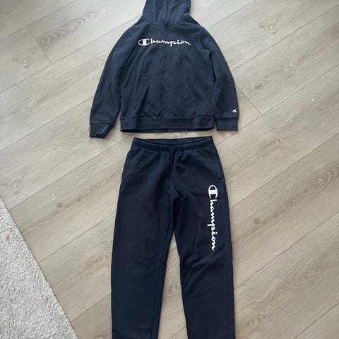 Deilig sett i bomull fra Champion. Har reparert to små hull i baken på buksa, men dette synes lite. Ellers helt og pent, og mye mer bruk igjen. Perfekt til hverdags!
