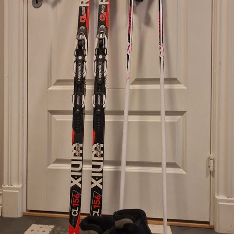 Ski type twin skin 182 cm, bindinger type Move, støvler dame str EU 39, staver 140 cm.