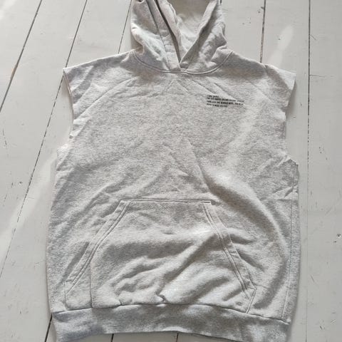 H&M ermeløs hettegenser for barn i størrelse 152, unisex. Genseren er grå og laget i bomull. Den har hette, kengurulomme foran og trykket tekst på brystet. Passer til hverdagsbruk alene eller over en T-skjorte eller genser.