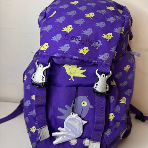 Beckmann sekk i gul farge med regntrekk. Praktisk barnehagesekk. Noen merknader, ikke prøvd å vaske bort.