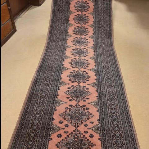 Dette er et håndknyttet Bokhara-teppe ofte identifisert ved sine tradisjonelle Yomut-motiver og dype røde fargemotiver.