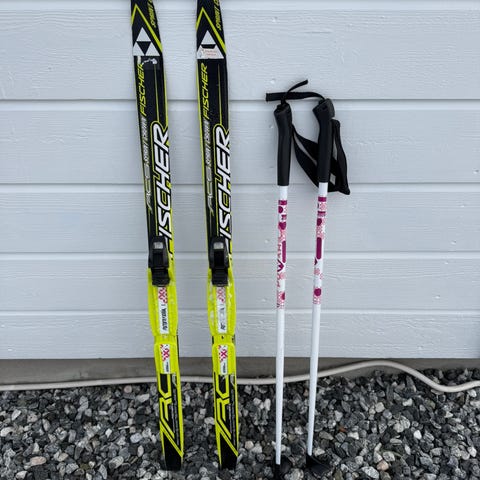 Smørefrie langrennski 140 cm, med staver og sko str 31. Sålen bør renses men er fin. Må hentes.