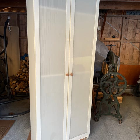 Godt brukt garderobeskap gis bort mot henting. Har løse hyller til de høye skapene.