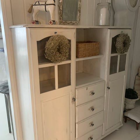 Høyt skap i tre med hvit overflate. Skapet består av flere seksjoner stablet oppå hverandre, med skapdører i front og skuffer nederst. Sidene har utskårne håndtak for enklere flytting. Innvendig har skapet hyller som gir god oppbevaringsplass til for eksempel maling, verktøy, tekstiler eller annet utstyr. Passer til bruk i bod, garasje, kjeller eller andre rom der det er behov for praktisk lagring. Veldig romslig skap. Trenger oppussing hvis man ønsker det strøkent. 193 høy, 128 bred og 51 dyp.
