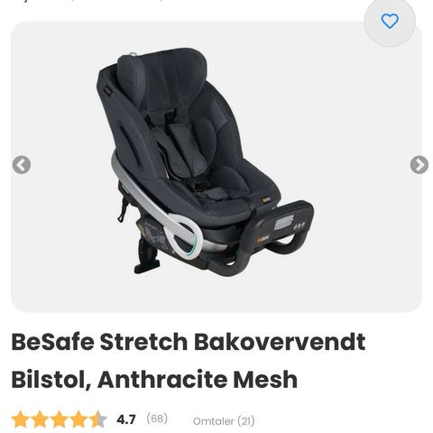 BeSafe er godkjent og et av de mest foretrukne sikre setene, derfor ble det valgt av oss. Setet monteres bakovervendt i bilen, og festes med bilens sikkerhetsbelte og støtteben. Det har integrert internsele og justerbar hodestøtte. Trekket er polstret like fint. Brukt av 2 bestemødre til 2 barn, og lite brukt av oss begge.