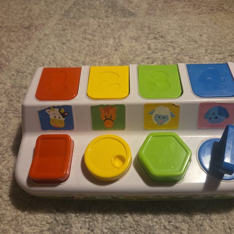 Fisher-Price aktivitetskube med flere sider med ulike aktiviteter. En side har telefonrør, tallknapper og bryter. En annen side har utskårne tall for innsetting av klosser, og en side har former for sortering av klosser. Lokket kan åpnes for å ta ut klossene. Leken er laget i hard plast og har sterke, flerfargede elementer tilpasset små barn 1-3 år.