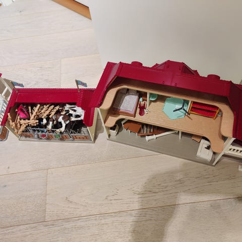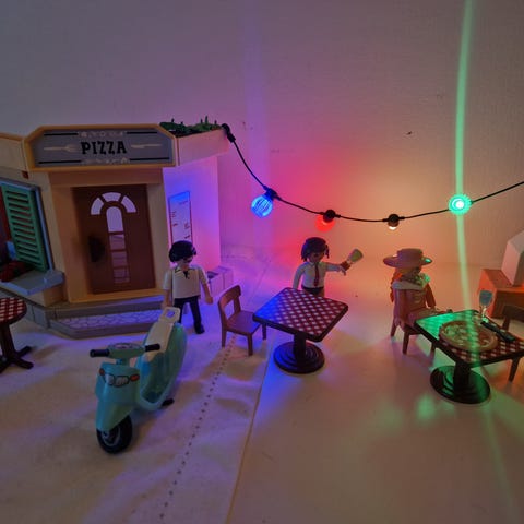 Pizza restaurant med fungerende lyslenke og lys i pizzaovn. Innhold : 3 voksne, 2 barn, 1 pizza, 2 pizzaesker, pizzaovn, motorsykkel, kasse med penger og litt småting